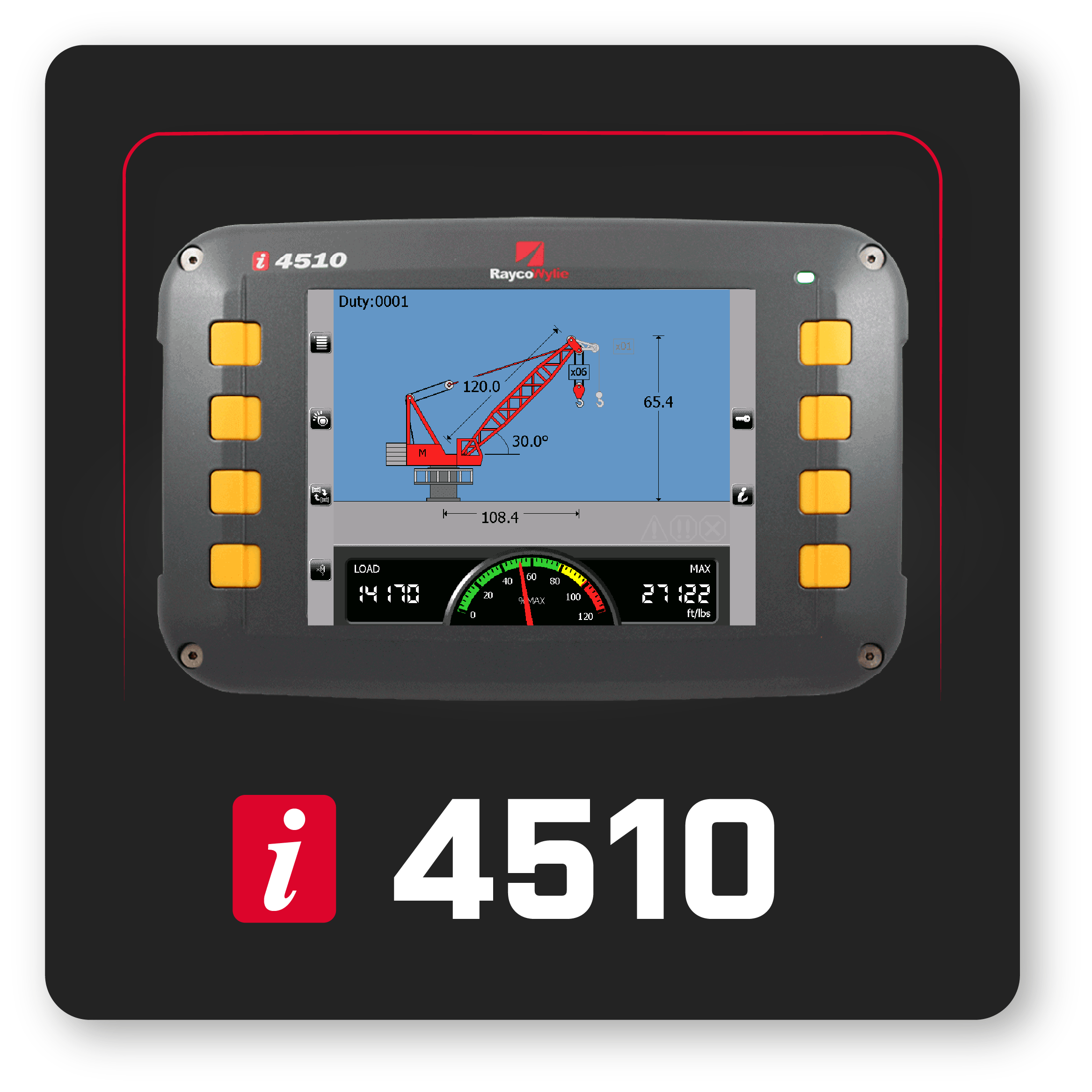 La série de systèmes i4500 (i4500, i4507 et i4510) a été développée pour répondre aux réglementations et normes toujours plus exigeantes de l’industrie des grues et du levage, tout en conservant des informations simples et claires pour l’opérateur. L’utilisation d’un écran couleur dans les modèles 4,3 po, 7 po et 10,4 po signifie qu’il existe toujours une option adaptée à vos besoins. Ceci, associé à l’autodiagnostic, à la convivialité pour l’opérateur et à la facilité d’étalonnage, maintient la série i4500 en tête de la concurrence. Les systèmes utilisent le protocole CAN bus J1939 pour communiquer avec chaque interface, surveillant constamment tous les capteurs de la grue afin de fournir des informations claires et précises à l’opérateur. Le réseau CAN bus offre également une grande flexibilité, vous permettant d’ajouter ou de supprimer des capteurs si nécessaire, à tout moment pendant la durée de vie de l’équipement. La série i4500 a été développée en pensant à votre grue, qu’il s’agisse d’une grue mobile télescopique de 5 tonnes, d’une grue sur chenilles de 100 tonnes, d’une grue à tour à volée variable de 80 m, d’une grue à tour à sommet plat de 10 tonnes, d’une grue à tour à col de cygne, d’une grue portuaire, d’une grue sur barge, d’une grue ferroviaire ou même d’une machine complète sur mesure ; la série i4500 de RaycoWylie aura la solution pour votre machine. Les spécificités de l’application sont détaillées dans les pages suivantes ; cependant, comme notre équipe de R&D développe constamment les systèmes, si quelque chose n’est pas indiqué dans la brochure, veuillez nous contacter pour discuter de vos besoins, car nous pourrons peut-être vous aider.